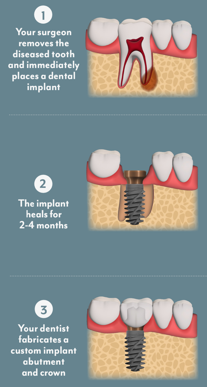 Implants are surgically placed into the jawbone where teeth need to be removed or are already missing. After the implant has healed, your dentist will make you a crown that securely attaches to the implant. Typically, a 2 to 3-step procedure, the experience of our surgeons and our advanced technology often allows us to place implants on the same day as the extraction, reducing your total number of surgeries and allowing you to get your final tooth faster. With our experience, what would normally require three surgeries and stretch over a year at another practice can be reduced to a single surgery and a new tooth in just a few months.